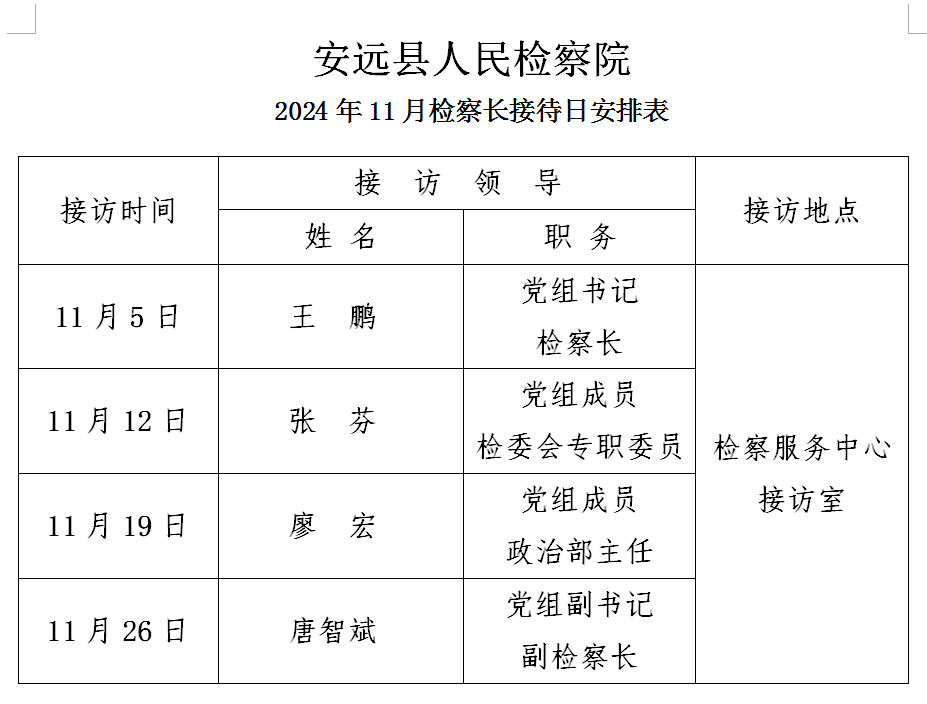为贯彻落实群众信访件件有回复工作,推动解决群众反映的实际问题,提升人民群众对检察工作的满意度,每周的星期二是检察长接访日。根据我院接访工作安排,现将安远县人民检察院2024年11月检察长接访安排公告如下: