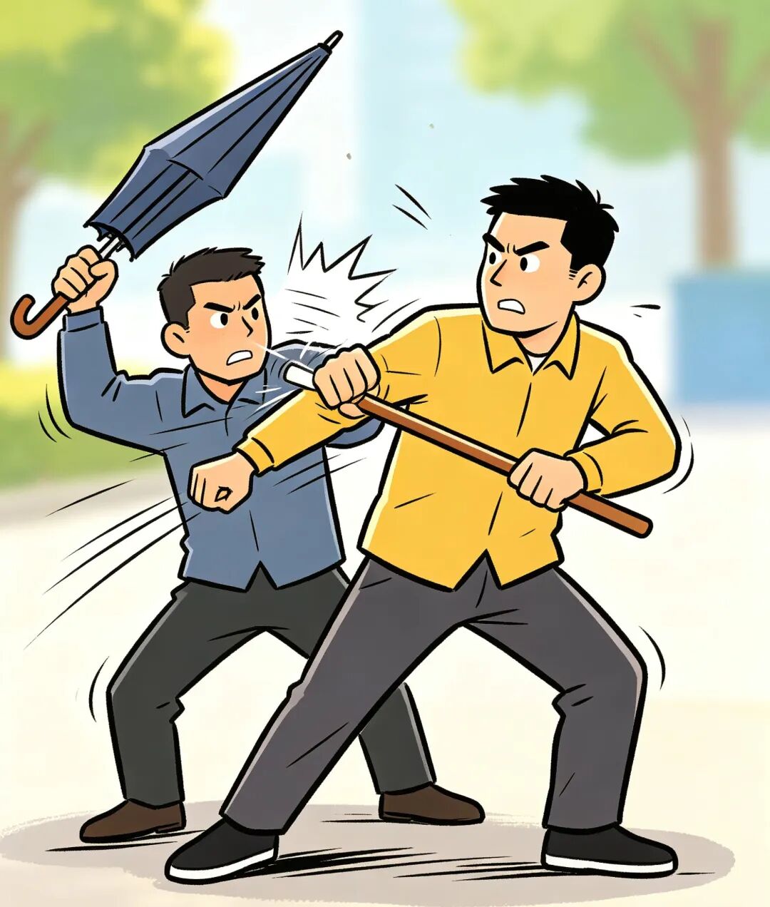 2025年11月1日15时许,货车司机刘某在某冷冻店门口卸货时,与货主陈某就卸货一事发生争吵,陈某冲向刘某对其进行了推搡,随即离开现场。后刘某老板黄某某听闻此事,便与刘某一起前往冷冻店门口找到陈某进行理论,双方再次发生言语冲突。期间,黄某某和刘某在附近各捡拾了一根太阳伞用的空心伞棍,手持伞棍向陈某走去,黄某某先是拿着伞棍用手推搡了陈某的左臂,紧接着刘某便在陈某左后方举起伞棍朝陈某身体左侧击打一下,随之陈某倒地。陈某倒地后,刘某与黄某某手持伞棍站在陈某附近,继续与陈某争执,在场其他人员则上前制止,直至民警到达现场。